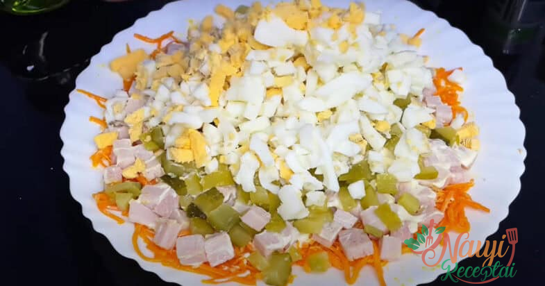 Agurkai ir virti kiaušiniai supjaustomi kubeliais, pasūdomi ir apliejami majonezu.