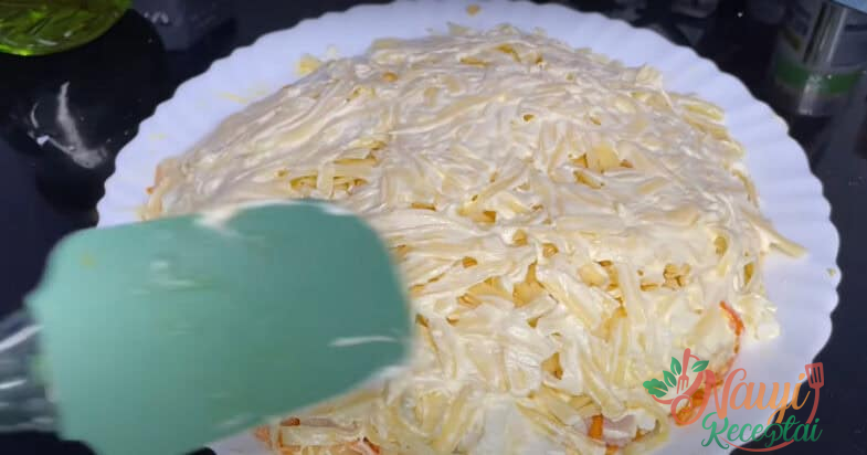 Dabar sutarkuokite sūrį ir aptepkite majonezu.