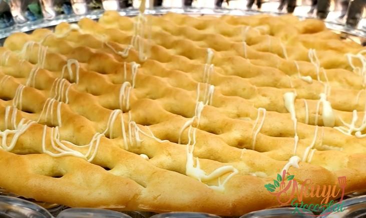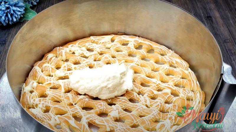 Sudėkite tešlą į konditerinį maišelį ir nubrėžkite tokio pat skersmens apskritimą. Apskritimo viduje padarykite ploną tešlos grotelių formą.