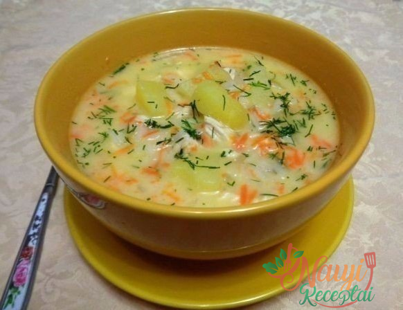 5. Tuo pačiu metu į sriubą suberkite lydytą sūrį. Sudėję visus ingredientus, labai gerai išmaišykite, įberkite krapų arba petražolių ir palikite sriubą troškintis dar 5–7 minutes. Gardi sūrio ir vištienos sriuba paruošta.