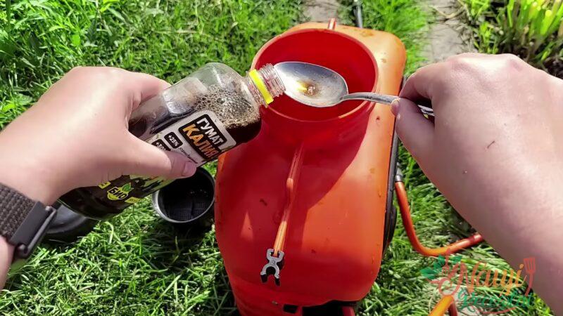 Mieles ir medų sumaišykite šiltame vandenyje ir palikite 30 minučių. Supilkite mišinį į kibirą su 10 litrų vandens ir įpilkite humatus pagal instrukcijas ant pakuotės.