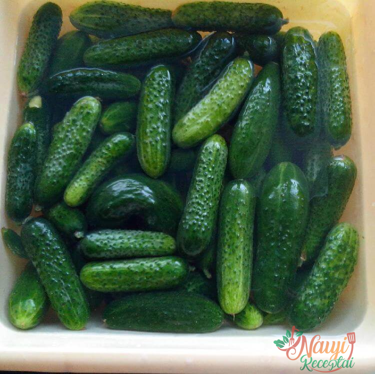 Kol ruošite indą ir visa kita, agurkus pamirkykite šaltame vandenyje. Užpilkite vandeniu sūrymui.