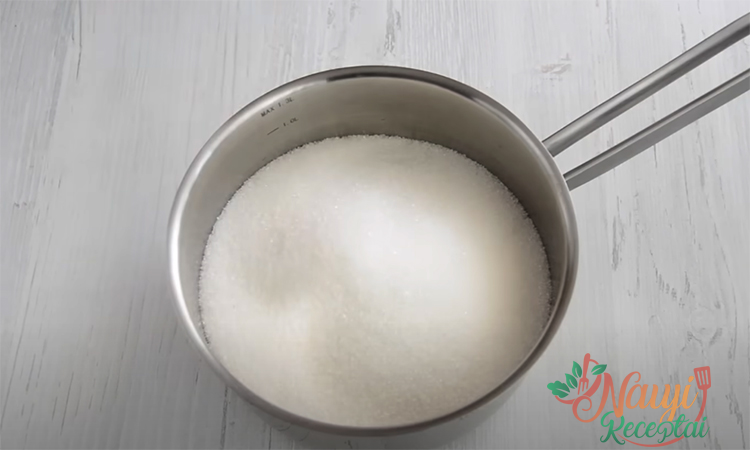Į puodą suberkite cukrų, įpilkite vandens ir citrinos rūgšties. Uždėkite ant vidutinės ugnies ir užvirinkite, švelniai maišydami silikonine mentele, kol cukrus visiškai ištirps. Įkaitinkite sirupą iki 130 °C, stebėdami temperatūrą kulinariniu termometru. Jei termometro neturite, patikrinkite sirupo pasirengimą įlašindami lašą sirupo į ledinį vandenį – jis turėtų sudaryti kietą rutuliuką. Nukelkite sirupą nuo ugnies.