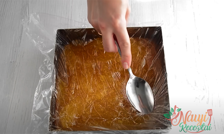 Supylus visą sirupą, mišinį toliau virkite ant silpnos ugnies 20–25 minutes, maišydami silikonine mentele, kol jis sutirštės ir lėtai nutekės nuo mentelės. Iš anksto paruoškite maždaug 18×18 cm dydžio formą: uždenkite ją plėvele ir patepkite augaliniu aliejumi. Karštą masę supilkite į formą, išlyginkite, uždenkite plėvele, taip pat patepta aliejumi, ir palikite kambario temperatūroje, kol visiškai atvės (geriausia per naktį).