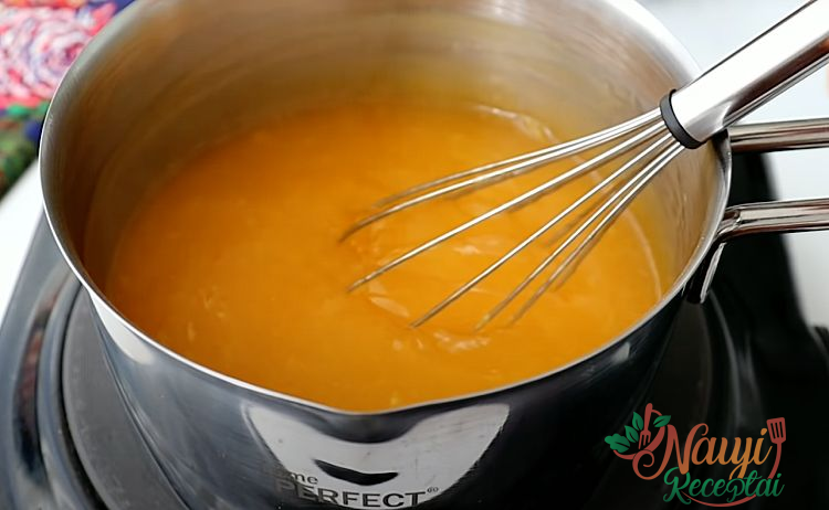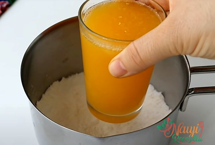 2. Supilkite apelsinų sultis į puodą arba storadugnį puodą. Palaipsniui suberkite krakmolą, intensyviai plakdami, kol jis visiškai ištirps. Suberkite cukrų ir vėl išmaišykite. Įsitikinkite, kad mišinys yra vientisas, be nuosėdų apačioje.