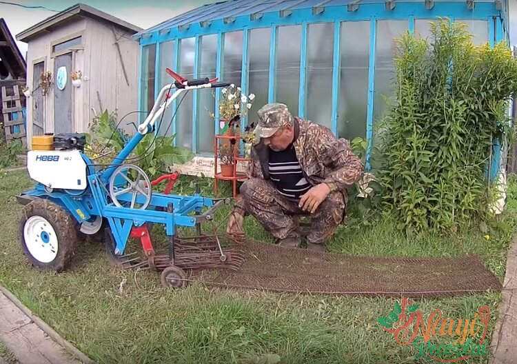 Šis technologijos stebuklas veikia taip: peiliai įsiskverbia į dirvą, kartu su gumbais pakelia ją ant tinklo. Kadangi jis vibruoja, žemė atšoka ir byra per skylutes. Beje, vyras tinklą paėmė nuo senos lovos ir prie jo pritvirtino ratukus nuo vaikiško vežimėlio.