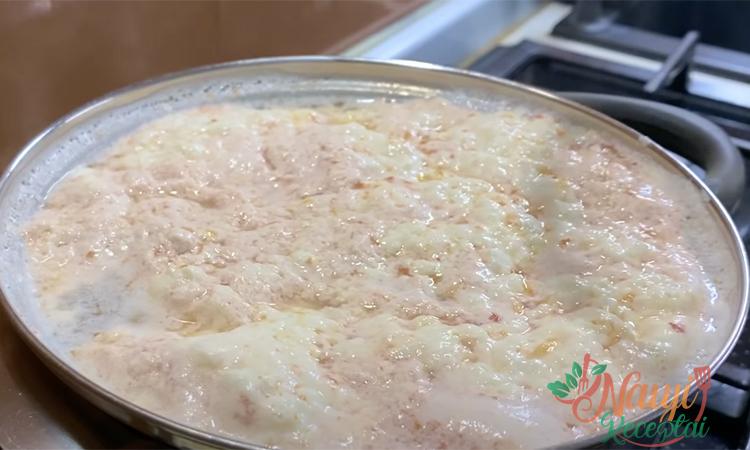 Sumažinkite ugnį iki vidutinės ir palaikykite ant viryklės 10 minučių, nuolat maišydami. Išrūgos pradės skirtis. Išjunkite ugnį ir palikite viską 10 minučių.