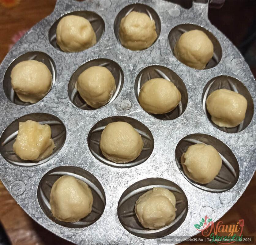 4. Įkaitinkite riešutų spaustuką ant dujinės viryklės, sutepkite jo ląsteles augaliniu aliejumi ir įdėkite rutuliukus.