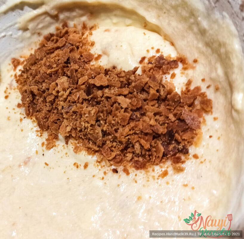 8. Sutrinkite sausainius į trupinius. Suberkite trupinius į grietinėlę ir išmaišykite.